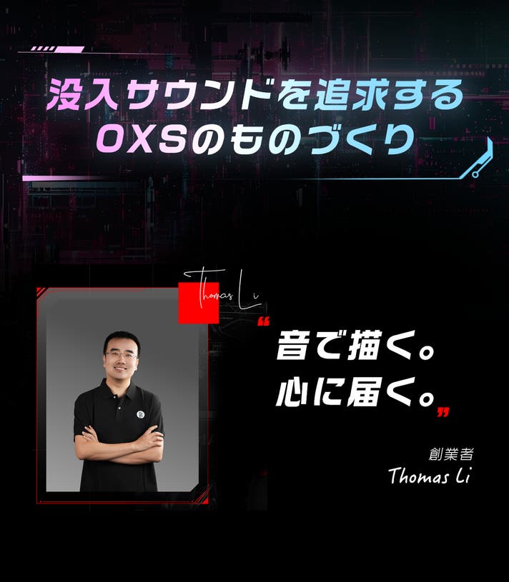 創業者Thomas Li(トーマス・リー)は、18年以上にわたり音響工学と組み込みオーディオ分野に携わってきた音響エンジニア。Harman、Philips、Jamo など世界的オーディオブランドの開発をリードしてきました。「音で描く。心に届く。」という想いからOXSを創業しています。音を通して、創造性や楽しさ、そして深い没入感を届けることを使命としています。