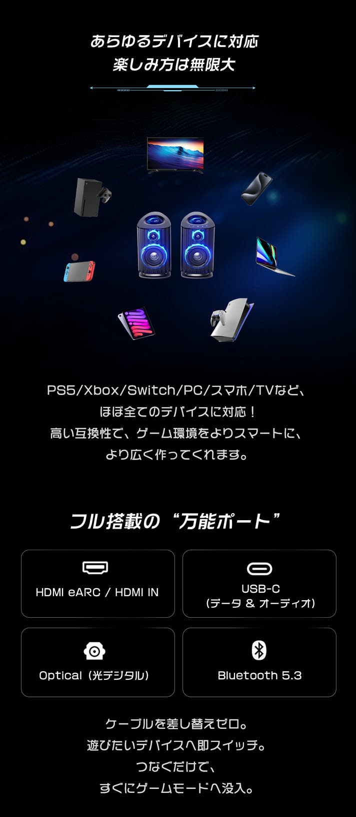 HDMI 2.1(eARC対応):PS5 / Xbox / TV(4K@120Hz対応)