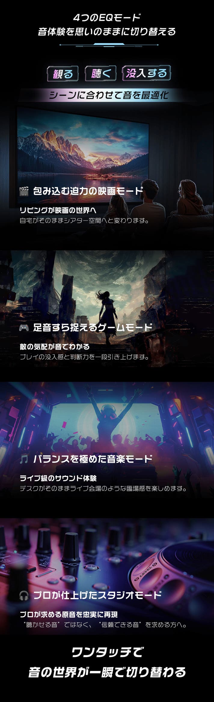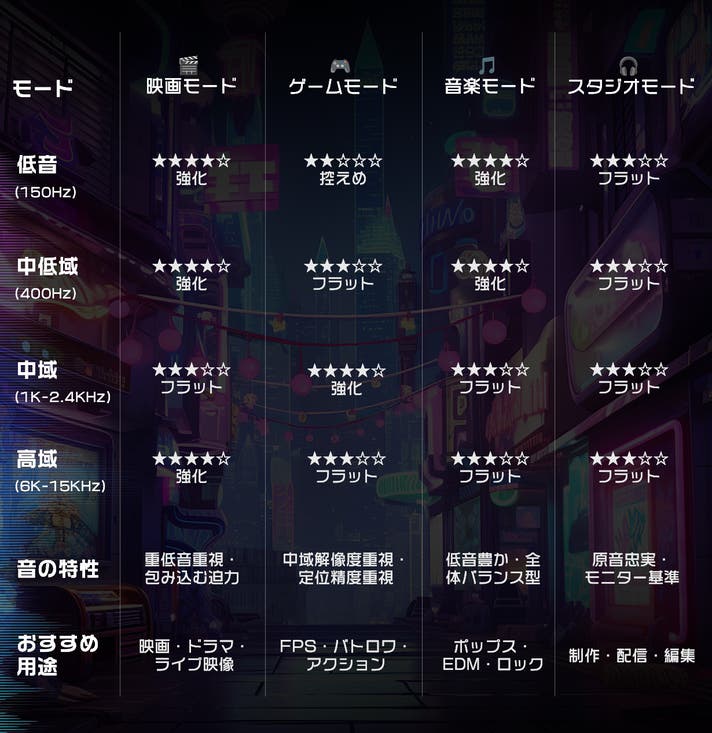 低域から高域まで、音源に寄り添う自動最適化。重なりが溶け合うほどに自然なバランス。音に込められた繊細なニュアンスを損なうことなく届けます。現場の温度、アーティストの吐息まで「音楽モード」でありのままに響かせます。自宅を最高のライブステージへ。