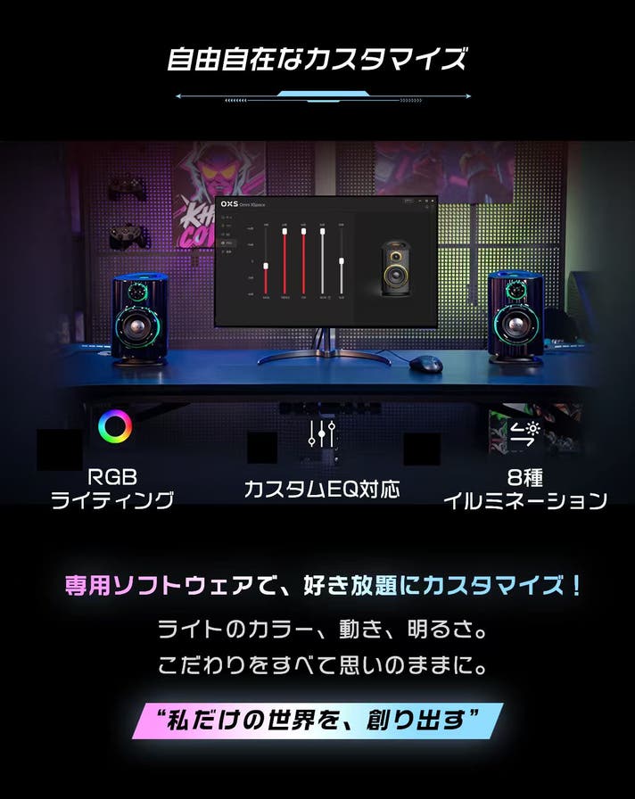 さらに、ソフトウエアで50色×8モーションのRGBライトまで自由に選べます。ゲームや音楽とシンクロする瞬間、光はリズムを刻み、音が空間を走り抜ける。