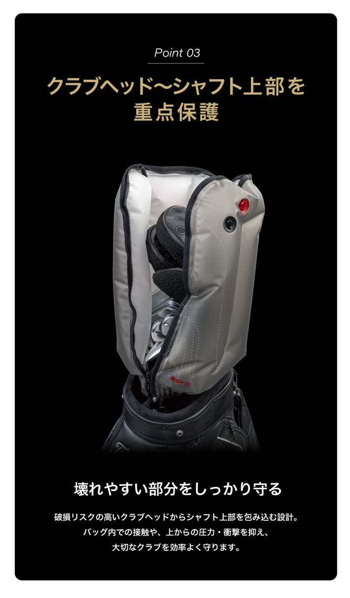 A. はい、柔軟にフィットします。空気の入れ具合を調整することで、スリムなスタンドバッグから、プロが使用するような大型のスタッフバッグまで幅広く対応可能です。また、ドライバーからパターまで、長さの異なるクラブをまとめて保護できるよう設計されています。
