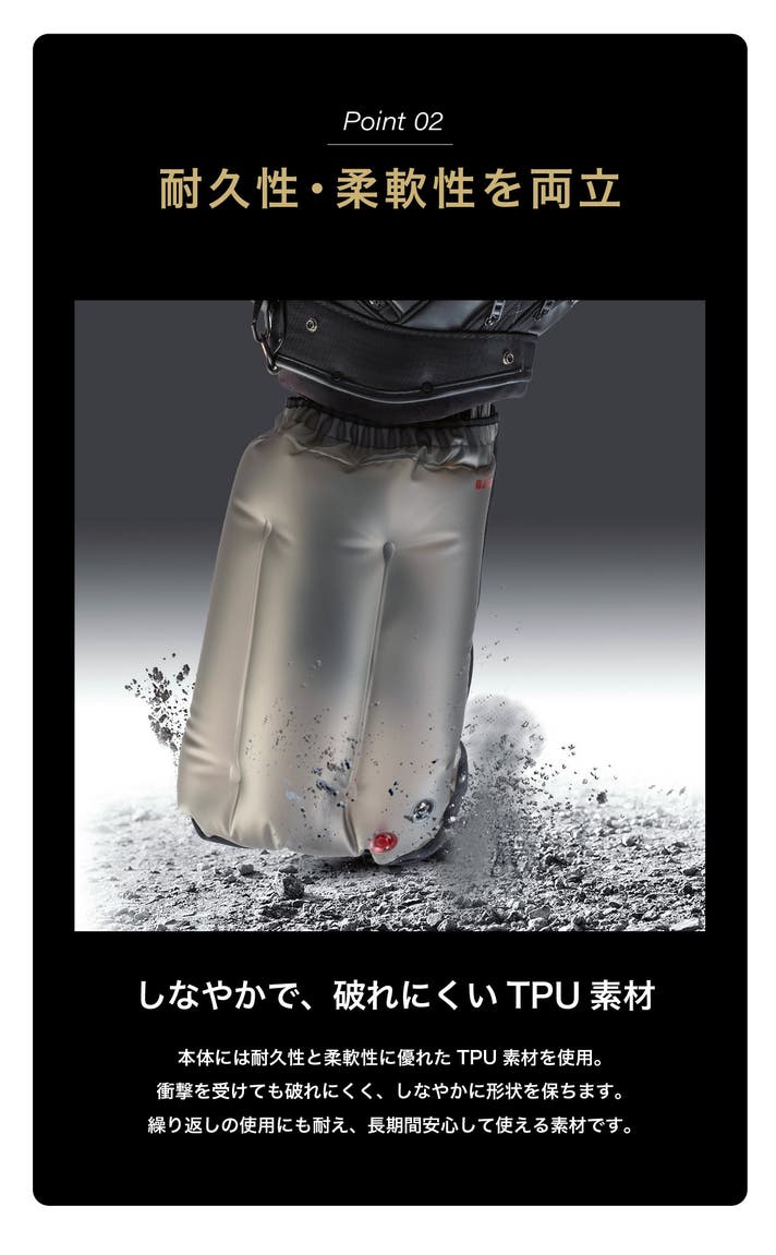 - ヘッドとシャフトの内側に空気層をつくり、 移動中の揺れや衝撃を徹底的に吸収し全方位をカバー。