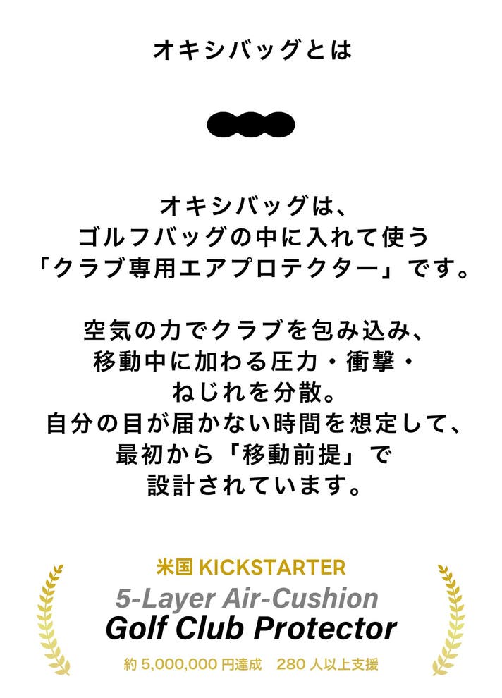 マクアケは、トレンドを生み出す人たちが集まる場所。私たちは、マクアケの皆さまにいち早くOXYBAGを体験していただきたいと考えました。あなたのサポートが、ゴルフクラブ保護の新しいスタンダードを形にします。