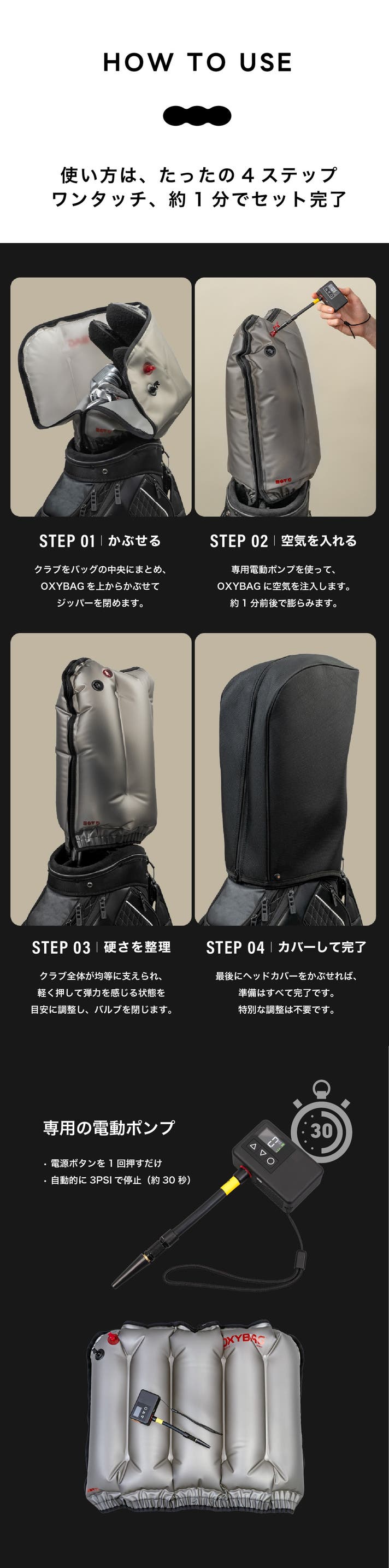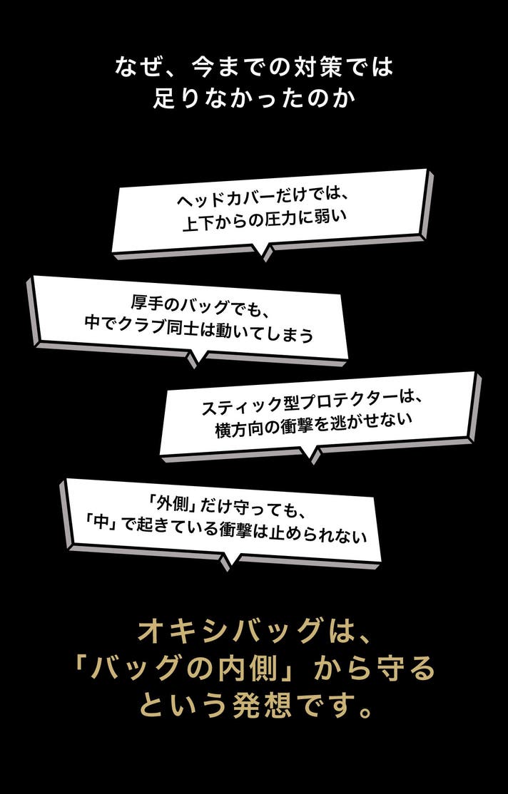 ゴルフを愛する人であれば、クラブを良い状態で保ちたいという気持ちは共通のはず。OXYBAGは、従来のクラブ保護アイテムでは十分にカバーしきれなかった部分に着目して生まれました。