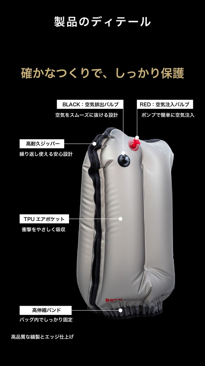 A. OxyBagは独自の5層構造(5-Layer Air Cushion)を採用しており、一般的なビニール製品よりも遥かに高い耐久性を備えています。万が一、外側に小さな傷がついたとしても、多層構造がクッション性を維持する設計です。