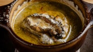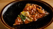 柔らかく煮込んだ鮑をなすの輪切りと合わせ、窯のなかで5〜6分焼き上げて完成。