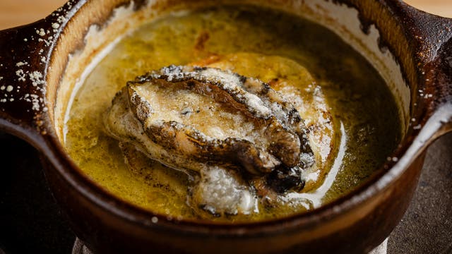 ボロネーゼのピザのあとに登場する窯焼き料理は、蝦夷鮑を使用。