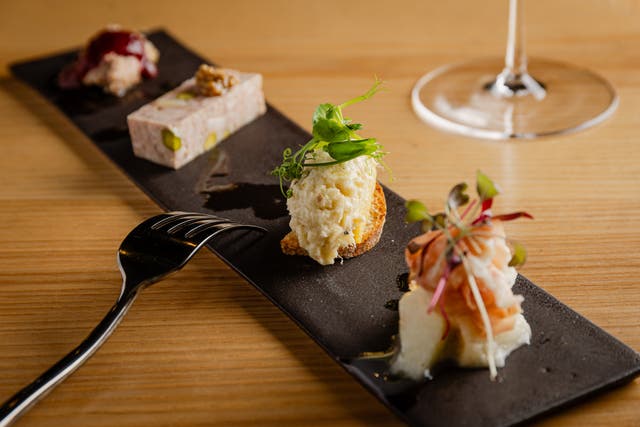 真鯛とじゃがいものリエットとポレンタをバゲットで挟んだものや、生ハムや洋梨、白茄子のコンポートなど、旬の食材を使った前菜は、その日、そのときしか味わえない一品揃い。