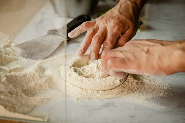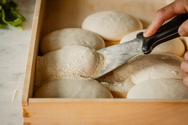 通常、ナポリのピザは耳の部分をさわらず、ふっくらした仕上がりをめざしますが、当店ではあえて指先で潰しながら生地を成形。