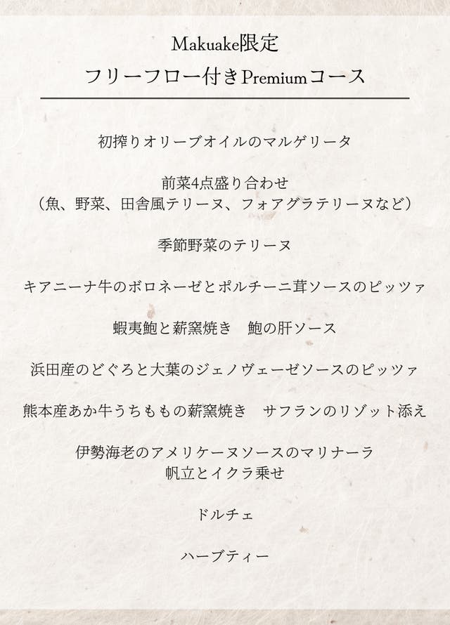 この度は、新たなお客さまとの出会いを求め、当店自慢のピザと薪窯料理による至福の体験をお楽しみいただきたいという思いから、Makuake限定の特別なコースを採算度外視の価格でご用意しました。