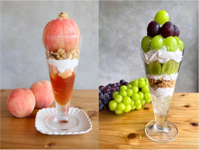 自家栽培のシャインマスカットやその子である赤色、黄色、薄緑色、黒色、紫色の希少品種ぶどうや「ちよひめ」「はなよめ」の早出の桃、ジューシーな日川白鳳、ほんのりピンクで固い「なつっこ」の桃、梨、柿などを使用したフルーツパンケーキやフルーツパフェ。そして卵と生クリームを使って作るフランス・アルザス=ロレーヌ地方の郷土料理のキッシュ…。その他、スタッフが熟考した創作料理やカフェラテや紅茶葉、コーヒー豆にこだわった紅茶やコーヒー等をご用意しています。