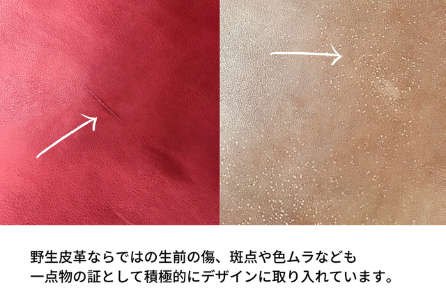 *野生皮革ですので傷や色ムラなどが入る場合がございます。「インプロンテ」ではそれらもデザインとしてご提供しております事をあらかじめご了承下さい。