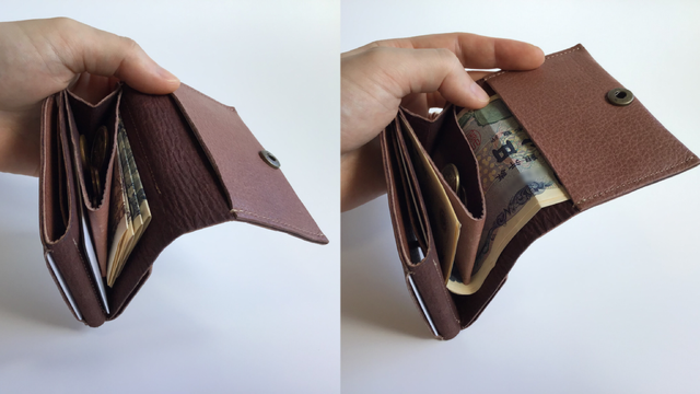 財布の内側(コインスペースの両サイド)に入れたお札やカードは