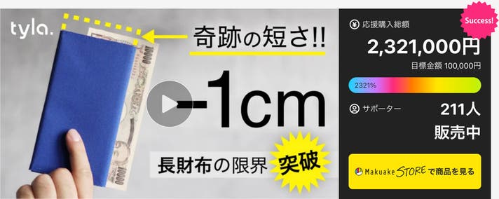 2024年にMakuakeでTyla長財布を掲載、目標金額 2300%を達成。