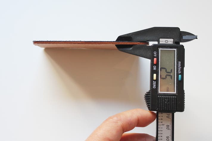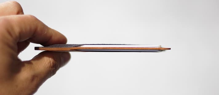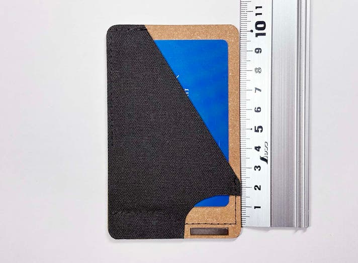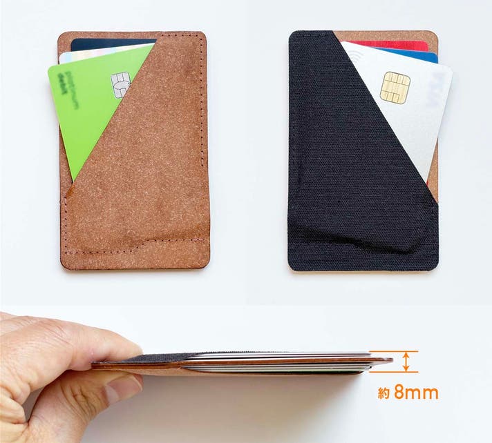 カードを入れていない状態で3mmの薄い形状、カードを入れても上記写真のような薄さを保ちます。(写真はカード4枚収納時)
