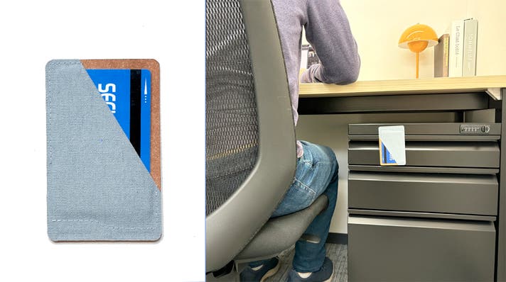 斜めにカットされたスリット形状によりカードはスッと入って、動いても溢れにくい設計。日常動作の中で自然に使える構造です。