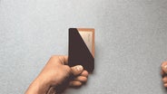 壁面にくっつけた時、カードの厚みで少し下に空きができる構造になっています。空いた部分に指を入れて取ってください。(カードが多いほど、空きが大きくなります。)