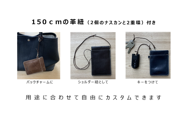 すべてのアイテムに自由に使える、150cmの革紐(2個のナスカンと2重環)がついてきます。短くカットしてストラップやバックチャームに伸ばしてネックストラップやショルダー紐としても活用できます。