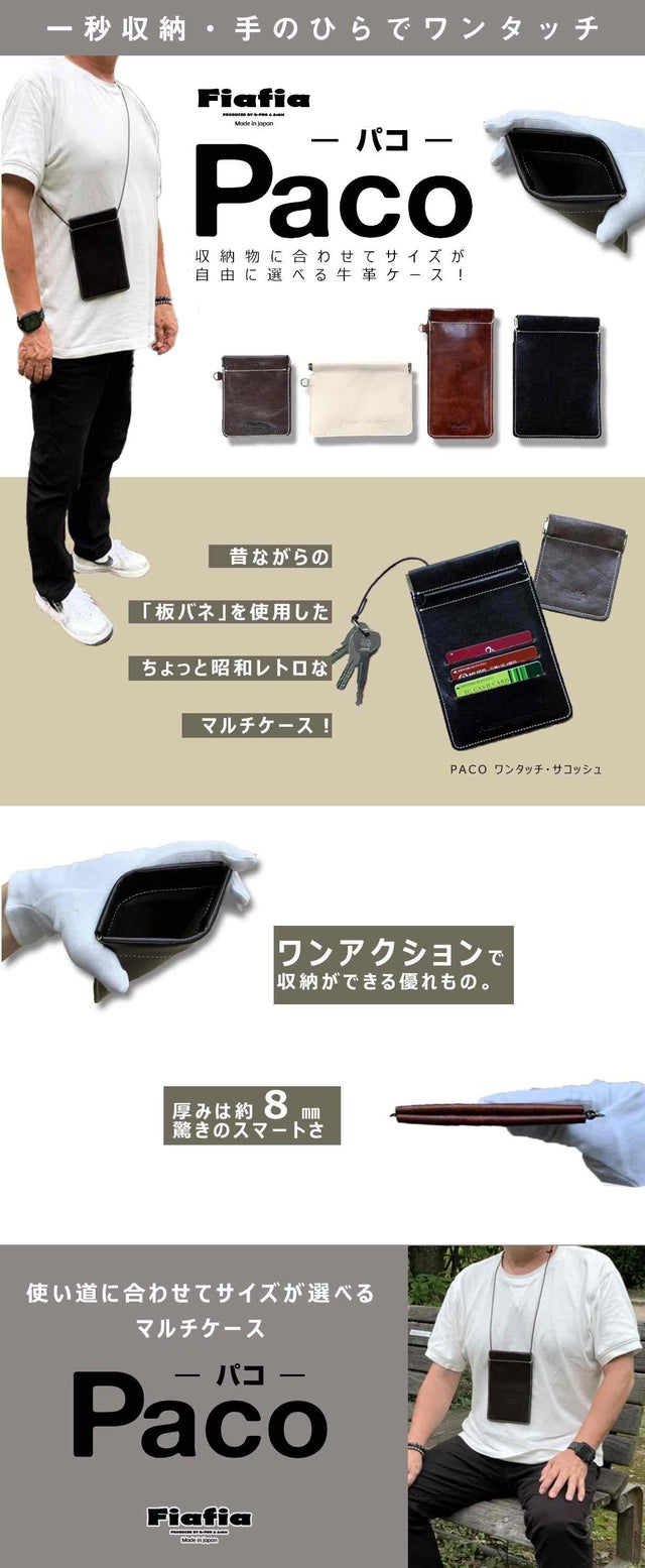 お釣りでもらった小銭をワンアクションで収納!電車内での、Bluetoothイヤフォン外すと紛失の心配が、でもバッグやリュックに取り付けた、PACOマルチケース・RやWIDEに片手で収納! メガネやサングラスもパットしまって、サッと取り出せるグラスケース。また軽くて邪魔にならない荷物の取り出しに優れた小さなショルダーバッグ・サコッシュ!(本体収納の他に裏面に3段のカードホルダーとワイドポケット)ミニ小銭入れも付いています。
