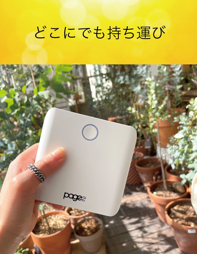 【Pagee】はわずか360gの、手のひらに収まるハンディサイズ。ポケットやバッグに収納しても、持ち運びの邪魔になりません。自宅はもちろん職場や旅行先などどこでも簡単に利用できます!