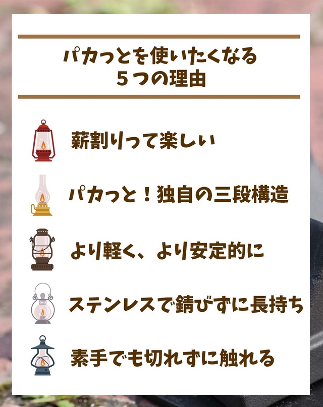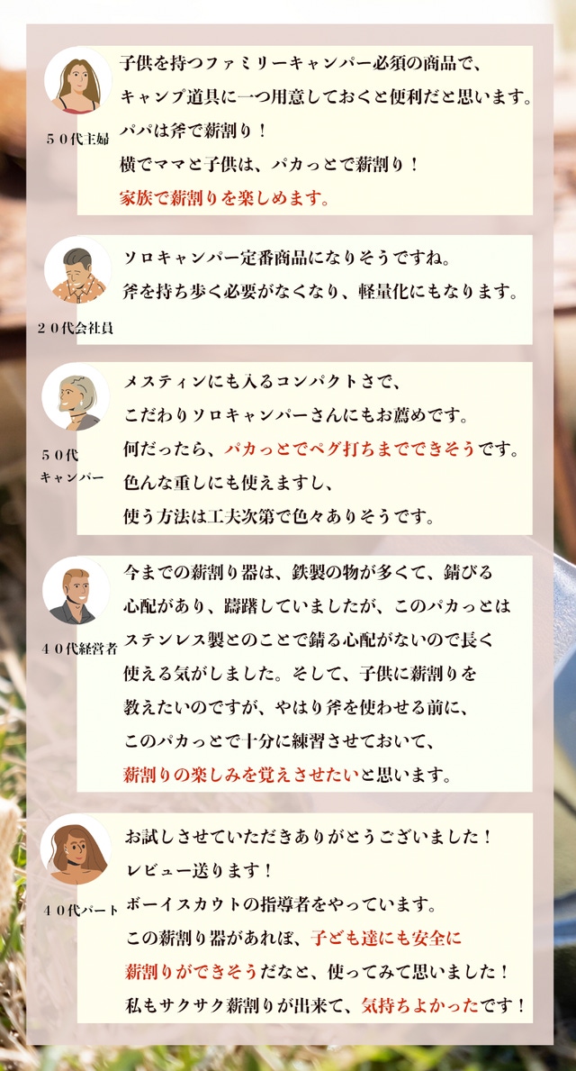 パカっと!で薪を割ったときの爽快感や、割れたときの音や感触をお子様はもちろん家族のみなさま達と共有して、みなさま家族の笑顔がさらに増えることを願ってこの商品の開発をしました。