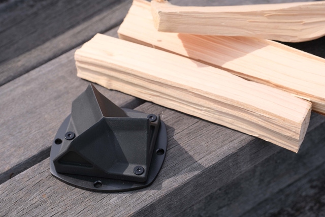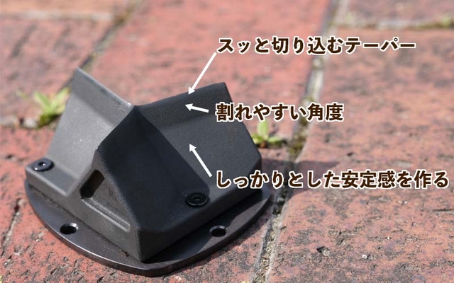女性や子供でも大きな力を加えることなく、薪がわりやすい形状を探した結果、底面を取り付け、底辺を広くすることにより、沈み込みを減らして、ハンマーの力がしっかりと受け止められる形状にしました。