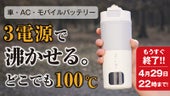- どこでも沸かせる!家庭用(AC)車(DC)モバイルバッテリー(USB)3つの電源に対応!