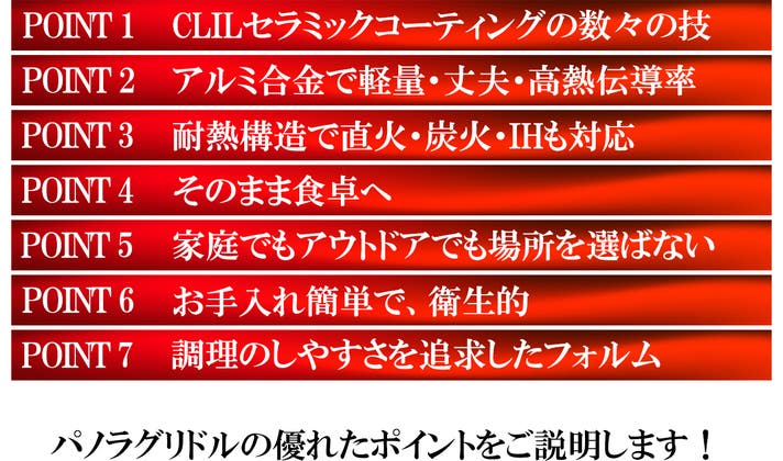 - 焦げつきにくい独自のCLILセラミックコーティング 時短・節約・美味しさの3拍子!