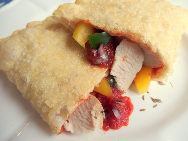 国産鶏肉をローズマリーとソテーし、ニンジンとキノコと一緒にレッドチェダーチーズを加えて、サクサクモチモチのオリジナル生地で包み揚げました。
