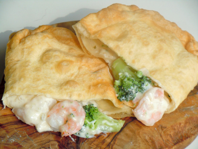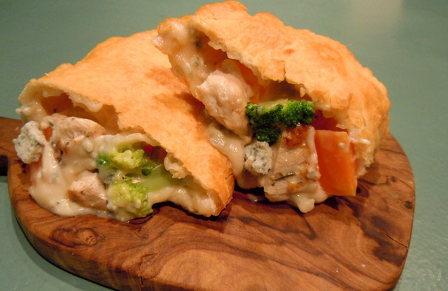 下ごしらえした国産鶏肉に蒸かしたニンジンとブロッコリを加え、クリームソースとゴルゴンゾーラチーズを一緒にパンツェロッテリアオリジナルのサクッとした生地に包みこみました。