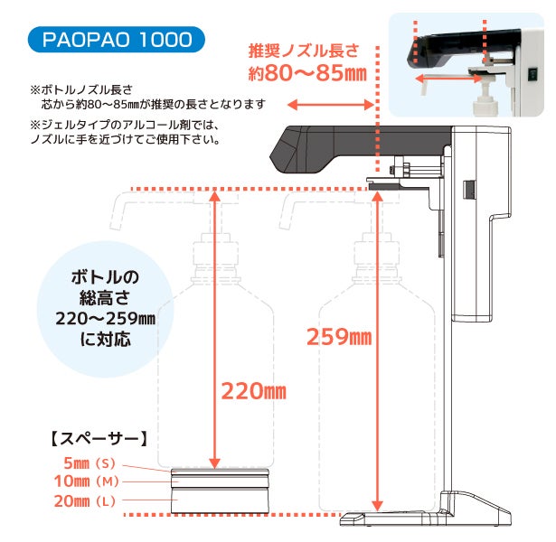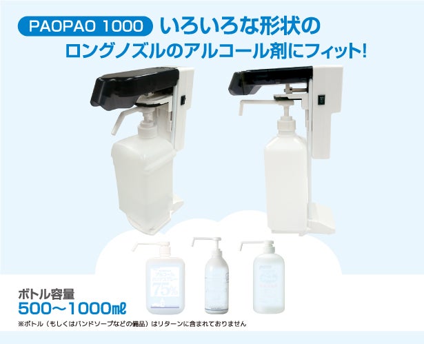 1. PAOPAO 1000 ボトル容量500~1000㎖の主にアルコール剤に対応。ハンドソープ、ジェルでも使用可