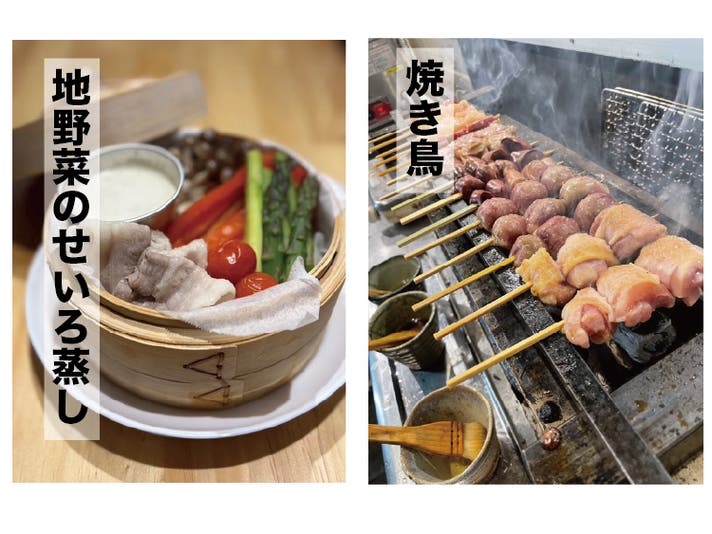 メインメニュー:地野菜のせいろ蒸し・みやじ豚の野菜巻き串 など