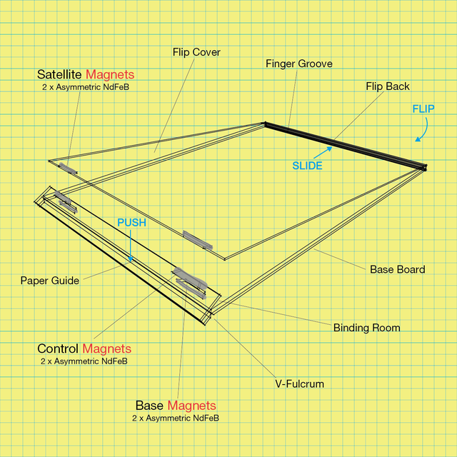 『マグネット』と『てこの原理』を掛け合わせることで、シンプルな構造で磁力の制御を可能にし、装着する用紙が少なくても多くても最適な磁力で保持することを可能にします(Snap Binding® Clip / 国内特許出願中)。