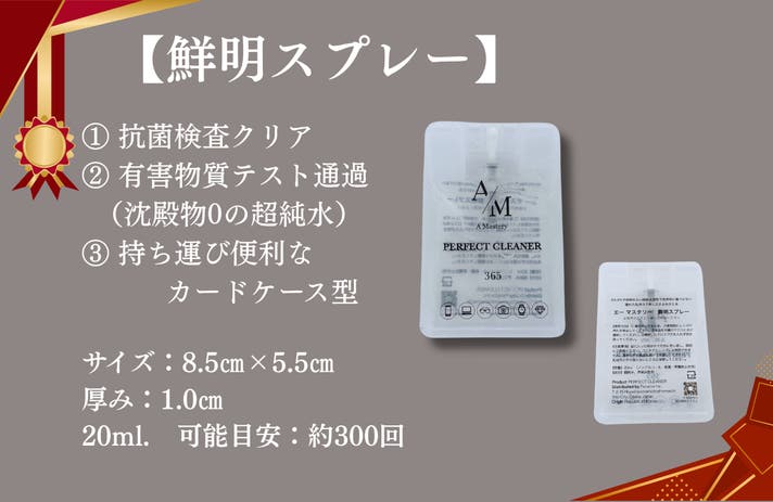 さらに今回は、「サッシュコードスタイル第5章」で大人気だった 「鮮明スプレー」 をセットにしました。手のひらサイズで「サッ」と拭け、いつも清潔を持ち歩くことが出来る所がこのアイテムの良きポイントです。