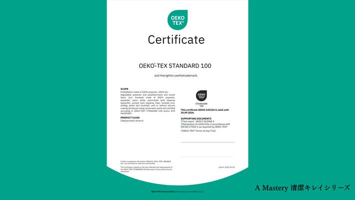 OEKO-TEX®(エコテックス)は、スイス・チューリッヒに本部を置くInternational OEKO-TEX Associationが管理する繊維製品の安全性に関する国際認証です。有害物質に関する厳しい試験基準をクリアした製品にのみ付与されるSTANDARD 100 by OEKO-TEX® 認証基準に基づいています。OEKO-TEX®は登録商標です。