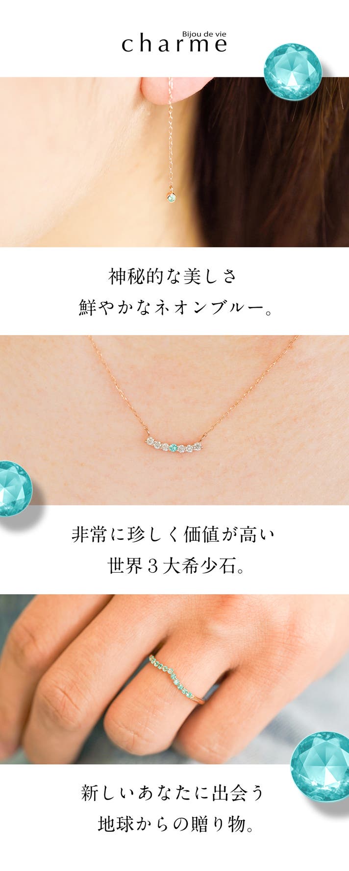 おそらく、パライバトルマリンを使った本物のジュエリーがこの価格帯で手に入るブランドは、『charme』だけ。とは言いませんが、⽇本でもほぼないのでないでしょうか!