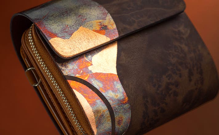 財布に施された焼箔技法による模様は、すべてが一点もの。