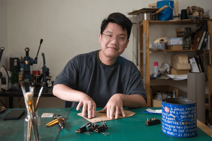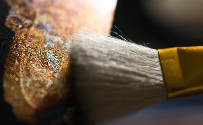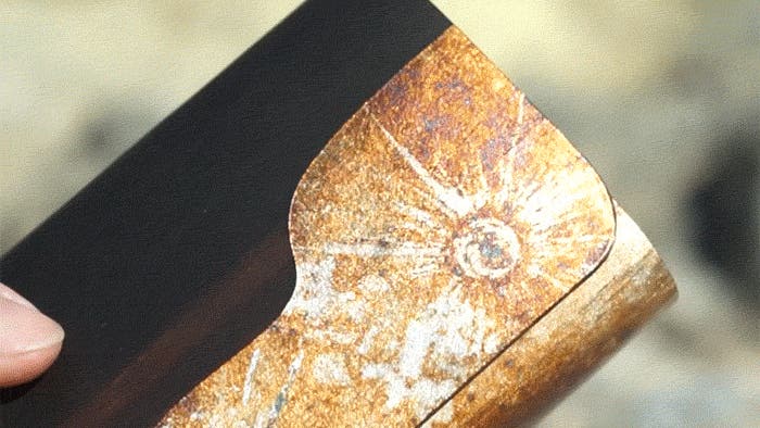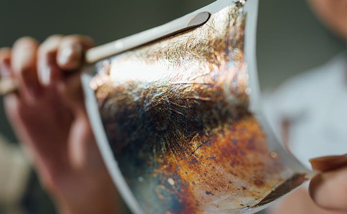 硫黄に反応して硫化すると色が変わるという、銀の特徴を活かした技法。極限まで薄く仕上げた金属箔に硫黄の蒸気を反応させることで模様が生み出されます。