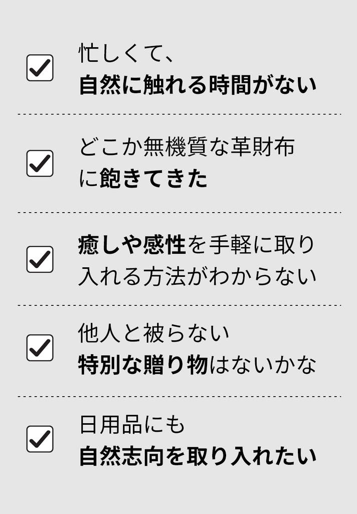 ですが、毎日森に行って、癒されることは現実的には難しいですよね?そんな時にこの樹木の財布を取り入れれば簡単に生活に自然を取り入れることができます。