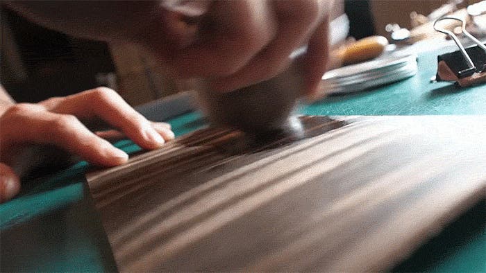 完成した箔は、透明な高硬度ニスで丁寧にコーティングされます。