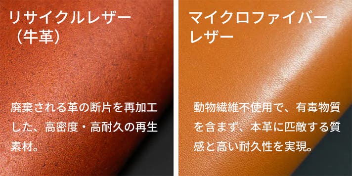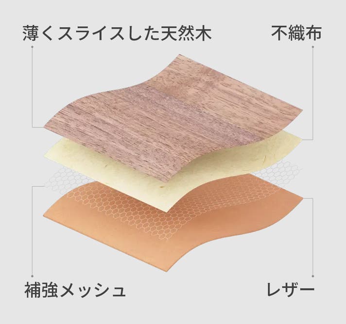 木の風合いを残しながら、柔らかさとしなやかさを持たせるために、不織布や補強メッシュを挟み込み、裏面には環境に配慮したレザー2種を採用しています。