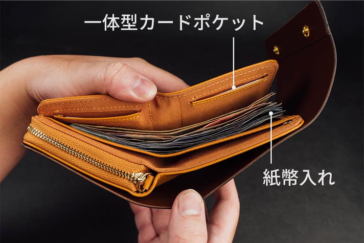 内側の一体型カードポケットには複数枚のカードをひとまとめに収納できます。また、紙幣入れには15枚以上収納可能で、各国の紙幣サイズにも対応しています。