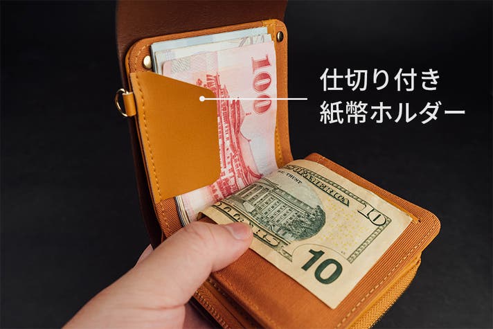 セミオープン構造の紙幣ホルダーは便利な仕切り付き。用途や通貨ごとに分けて収納することもできます。