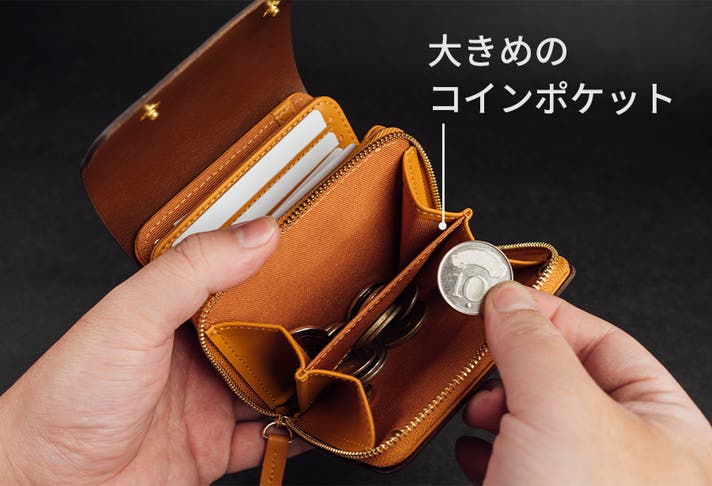 大きめのコインポケットは仕切りが付いているので仕分けも簡単。ファスナー付きなので落下する心配がなく、カギや小物の収納にもぴったりです。