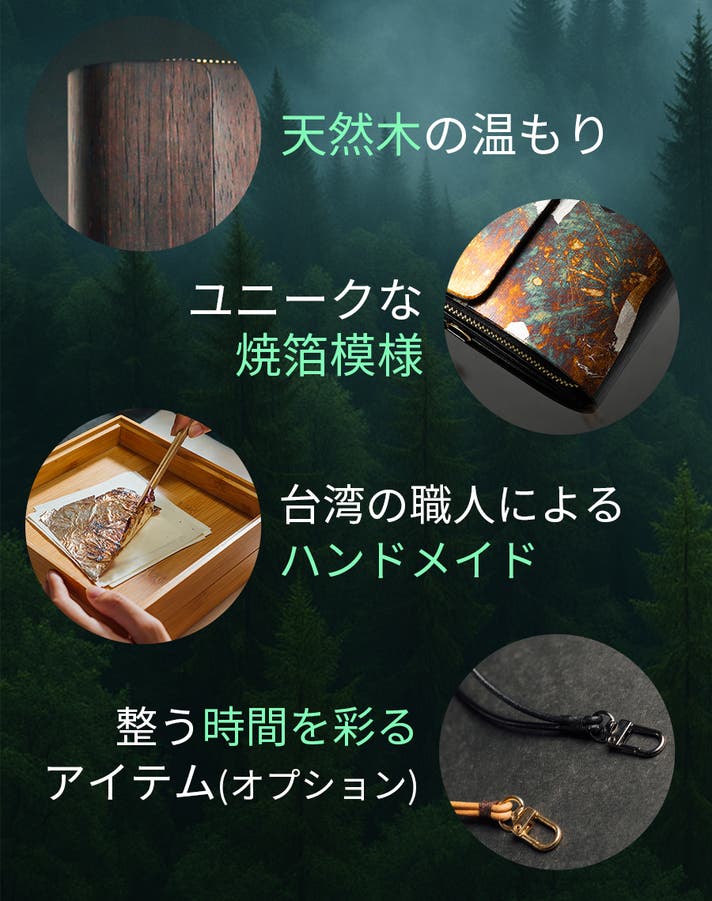財布と一緒に選べる、こだわりのオプションをご用意しました。自然と調和する香り、素材を守るケア、暮らしに馴染むストラップ。