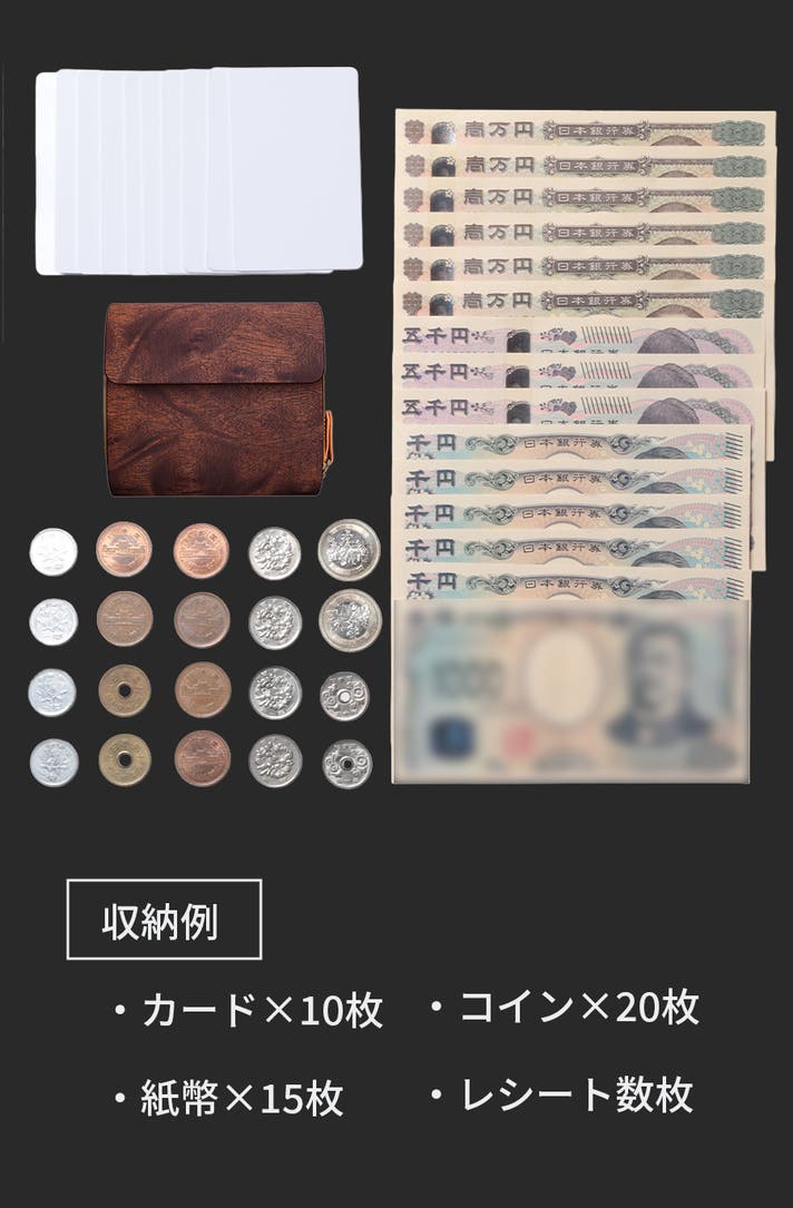 見た目はコンパクトながら、カードや紙幣、コイン、レシートまでしっかり収納できます。スマートなフォルムの中に、必要なものがすべて収まります。