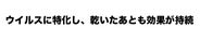 製品にはPDMC(ポリアミン誘導体カチオン)を使用する事で、アルコールの様に揮発することなく、またエタノールや次亜塩素酸ナトリウムとも異なり、成分が表面に存在する事が可能であり、PDMCが付着している表面は時間が経過しても抗ウイルス効果を発揮します。