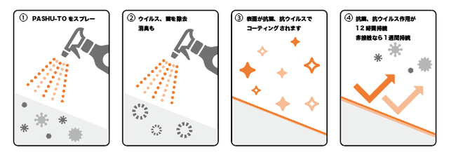 PASHU-TO(パシュット)は菌だけでなくウイルスに作用するため、スプレーするだけで効果を期待できます。自分や大切な人をウイルスの脅威から守ります。