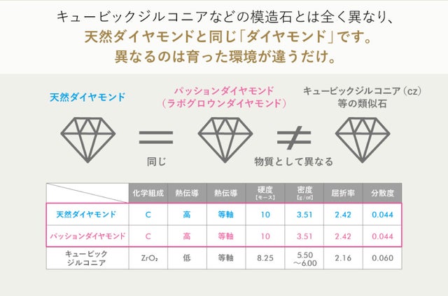 一方、ラボグロウンダイヤモンド(パッションダイヤモンド)は、天然ダイヤモンドが生まれる地中奥深くの高温高圧の環境を地上のラボ(研究所)で人の手によって作られる為、内戦や奴隷労働に無関係で、地表も傷つけることなく作り出され自然環境にもやさしく、何も犠牲を払わない「エシカル」で「サスティナブル」な『ダイヤモンド』なのです。