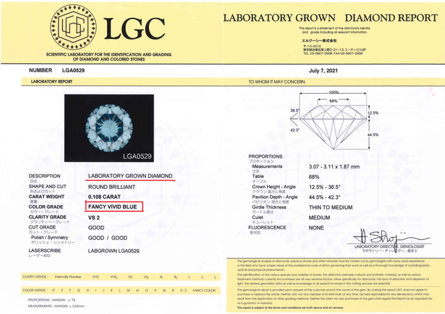 品質保証として、ダイヤモンドを鑑定する鑑定機関にて、今回使用するダイヤモンドのロットから代表で鑑定結果を記した鑑定書です。